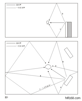 图1是实验布置图。当向一只音箱输入一个短促的信号后,聆听者最先听到的是离音箱最近的直达声。然后听到的是按反射路径长短次序来的一次、二次、三次……乃至多次反射声。为简明起见,图中仅画出6个一次反射声。如果室内墙面反射很强,那么,随着时间推移,反射声的密度越来越密,强度逐淅减弱,最终消失。