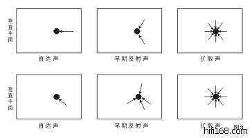 图3就是图1和图2中直达声及反射声的“刺猬图”。为便于一般读者理解,把分解为垂直和水平两个部分,每一部分中,把直达声和早期反射声及后期反射声分开来表示。到达室内某点声音的方向用箭头表示,其强度大小用箭柄长度表示。图中垂直平面上直达声用虚线表示,这是因为它是水平面上直达声在垂直面上投影的缘故。早期反射声只画出1-6个一次反射声。后期反射声是充分扩散的,某点的后期反射声来自各个方向且强度相同。如果把图3与图1对照起来看,是不难理解的。其实,图3各图中的声线是集中在一个点上的,这个点上有着许许多多方向不同,长短不一的“刺”,活象一只“刺猬”故得名。显然,室内不同点处的回声图是不同的,“刺猬图”也是不同的。二者联合起来,充分地表示了室内某点所接收到的各种声音的强度,方向以及时序。只是尚不能反映反射声的频谱结构相同,因此要在大小形状不同的房间里听到完全相同的声音几乎是不可能的。严格地说,在同一房间的不同地点,声音也不可能相同。这种情况下免令人十分沮丧。不过,好在人耳的听觉分辩力是有一定限度的。声学家们由此看到了希望和前景。只要对室内的反射声作出适当的控制,在不同的房间中听到相近或相似的声音并非完全不可能,而且在小房间中听到类似于大房间的某些声音效果也并非完全不可能。大家想必记得,日本雅马哈公司在介绍他们的数码家庭影院时说过,他们实地勘测了世界上著名音乐厅和其它演出现场的声场特性,然后通过DSP(数码声场处理)技术在普通的听音室中重现出原来的现场效果。他们所实测的现场声场特性中,最主要的就是回声图。所不同的是,雅马哈采用多声道电声技术来模仿现场效果,而声学家则采用纯声学的手段来实施,难度便可想可知。