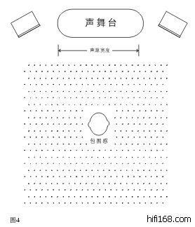 家庭中用双声道立体声设备欣赏大型交响乐时,在两只音箱之间会出现一个“声舞台”它通常出现在两只音箱之间的连线上,它有一定的宽度,有时还会感觉到有少许深度(图4)。一般来说,人们能够比较正确地分辩出“声舞台”上各声部的左右位置,有时还能感觉到乐器有前后之别。这个“声舞台”令人印象深刻,这正是双声道优于单声道的魅力所在。