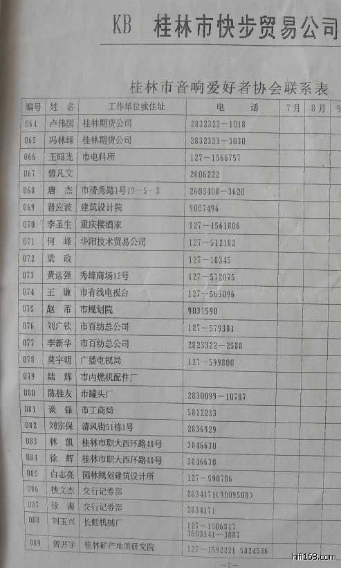 原帖由 GL牛魔王 于 2011-4-25 10:04:00 发表呵呵!这是15-6年前的老表格了,根本就没有什么网名可言;可能是当时的工作上有某些遗漏,还有好几个也是协会成立时交的资料和会费,那时我就发现没有刘广钦.李新华等和我自己的名单,不过这不重要,最重要的是玩的开心。以后过去桂林找兄弟们听野。也是方便不少的。呵呵!