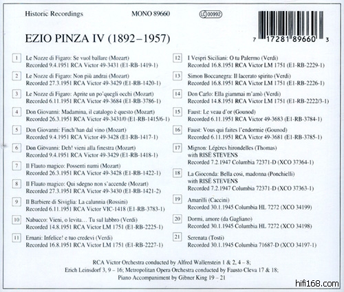 Ezio Pinza最著名的角色包括Don Giovanni,Ramfis(Aida),Padre Guardiano(命运之力),Fiesco(Simone Boccanegra)。他的声音结实、柔和、有弹性,这张唱片虽然收录的是1945、1947、1951的后期录音,仍然有着不可思议的魅力。