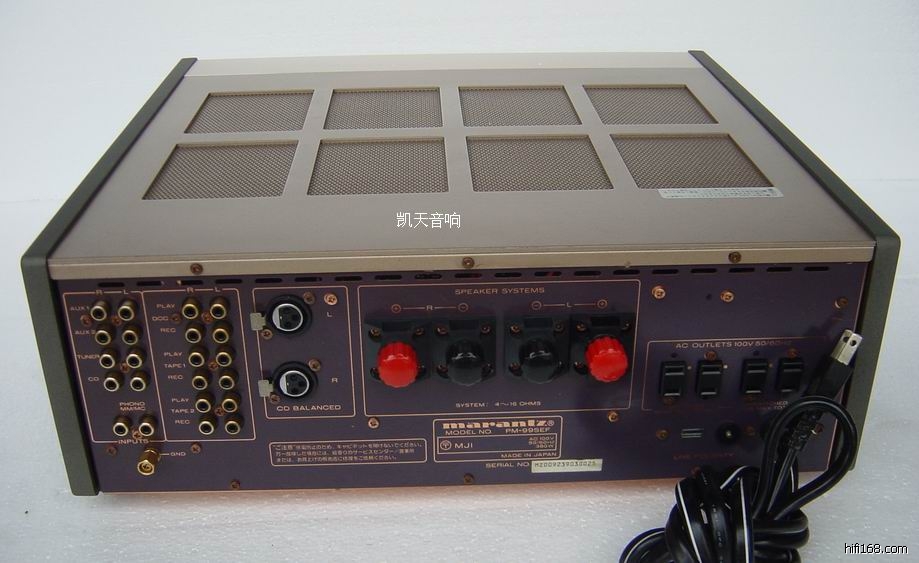 本店经营音响多年。信誉超群。所有货物都经精心挑选。如果商品不能让你满意。本店15天内包你退换!保修一年!(凯天音响部)是你最值得信赖的商家!是你无悔的选择! 日本著名影音器材MARANTZ(马兰士),诞生于1952年的美国,它和DENON被誉为世界两大名牌。五十多年来,马兰士 MARANTZ 为世界影音器材市场提供了许多高级、出色的影音器材,而受到专业人士垂青与赞誉。马兰士 MARANTZ 注重科技的发展和市场要求的更新,对产品的功能质量进行不断的改进和提升,在专业领域稳稳地占据着领导者的地位。MARANTZ经过多次的资源优化重组,现已成为日本最大的影音器材生产商之一! MARANTZ PM-99ES是属马兰士公司目前技术最高水准为最顶级的功放,其优美的工艺,相当让人心旷神怡,此机同样属甲类功放器,设计这更是给机器增加了平衡输入.机器内部全部采用OFC(无氧化铜)运输电路板。使它的音质传送达到尽善尽美!而音质。当然不用多说》声势如深山流水,静中有动,特有魅力。 此机器有9.5新,几乎全新,没有修过,没有摩过,如有PM99这机器难得,但如有这样成色更加难得,可说十年不得一见!
