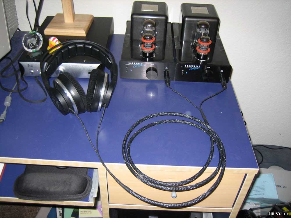 Now I'd like to say a little something about the Head-Fier that performed the mods on my Darkvoice 336i's. Fitz is an incredible talent! I can't believe he's just 22 years old. He must have started his electronics training at age 3. His attention to detail is amazing. He put in new LED's for me that wouldn't perform Lasik surgery on my eyes everytime I powered up the amps. He asked if I'd like some amber ones to match the tube glow, and I said I thought that would look great. I assumed he'd order a set of amber LED's and that would be that. Well he had other ideas, he ordered 7 various amber and orange pairs of LED's, then made a template to mount them in, set them next to the warmed up amps, powered up all the LED's and picked the pair that most closely matched the tube glow of my amps. Is that service or what? And they are a perfect match. The new XLR connectors are flawlessly mountend into the front and back of the amps. The new volume knobs are beautiful. And the new Alps volume pots are so much nicer than the stock units. I hadn't realized how crappy the stock volume pot was until now. And he performed his incredible "tube hum be gone mod". There's no tube hum at all. Fitz also made me several new cables, and reterminated, braided and resleeved my existing Headphile cable on my K340. I love the braids on his cables! I also mentioned that I'd like to recable my new Orthodynamic Yamaha HP-1 headphones so that I could use them with my new amps. This was after inquiring about getting Fitz to recable them. He is backed up on orders due to the scale of this project, and the possitive attention his his cables are now getting. I really wanted them recabled yesterday. Well in the box with everything else was all the wire I'll need to do the job, a length of it already braided with Fitz' cool braid, nylon sleeving, heatshrink, and even some desoldering braid. How cool is that!