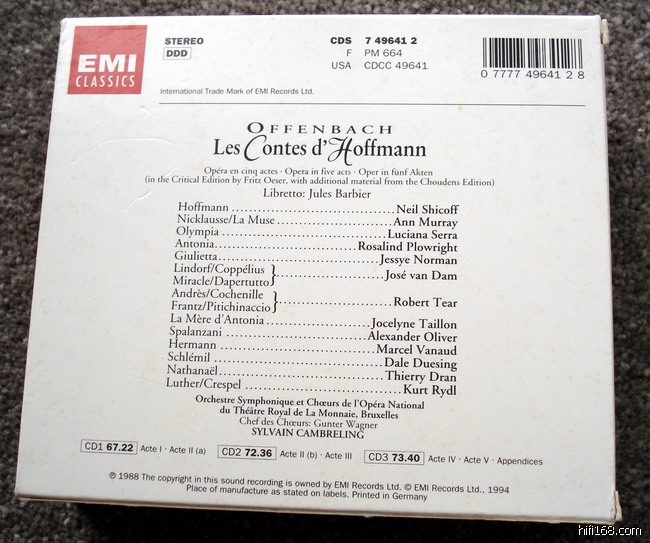 再说唱片版本,我的这套Cambreling指挥的录音采用的是比较完整(也可能是最完整)的欧瑟补完版(Oeser Edition)。市面常见的另外两个版本——克路易坦和邦宁吉的版本都是两张,而这套是三张,并且是比较满的三张。另外根据作曲家的意愿,剧中的三个女主角——象征女性的三个侧面——要由同一位女高音担任。很多录音版本里也是这么做的。但实际上这三位女角的脾气秉性全然不同,因此对演唱要求的重点也不相同。Olympia的唱段突出花腔和高音,Antonia的部分强调抒情,而Giulietta的部分戏剧的成分比较重。要同时胜任这三个角色,对歌唱家来说是个很大的挑战。我感觉就算能勉力唱下来,效果也很难达到理想,所以不如用不同的人来唱。我的这个录音就是采用这种方式,我认为效果很好。如果不这样的话,让Jessye Norman以她那肥厚的嗓音去唱冷艳的Olympia或者柔弱的Antonia,那效果,噫~简直不堪设想!