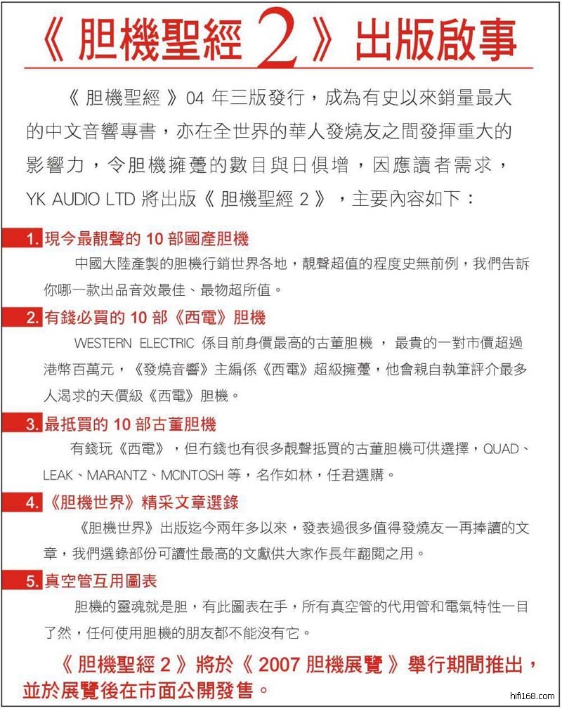 鉴于〈胆机圣经1〉内地发行量有限,不少发烧友因错过购买时间,至今都寻觅不着,因此〈胆机圣经2〉月底首批到货,希望需要收藏的发烧友请尽快落手啦^_^