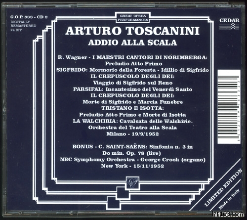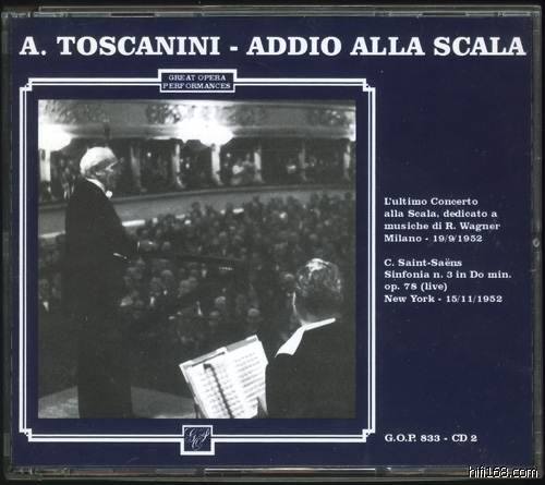 这场演出作了完整的录音,意大利G.O.P(Great Opear Performances)在2002年首次完整发行。整场音乐会都是的Wagner的作品,开场是“名歌手”前奏曲,在50多年前,托老登上Scala指挥的第一部歌剧就是“名歌手”,其纪念意义不言而喻。听众的狂热情绪在录音中显而易见,甚至在“名歌手”前奏曲中,冒失的听众在结尾鼓错掌。意大利出品……我们不能期待音质修复能得到可喜的成果,不过这的确是让我激动不已的音乐会。在另外,CD2还附送了1952年11月15日带领NBC的现场“管风琴”交响曲,不过这曲没有象告别音乐会那样保留着MONO面貌,毛病又范了——假立体声,细听起来,技术相比之前的确有改善,不能说是那种一听就让人厌恶的声音,兴许再过若干年,假立体声真的能够跟MONO一较天下。