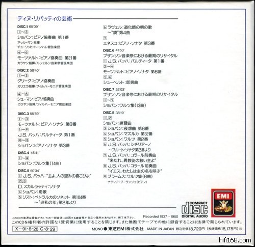 上面是日本东芝EMI 1991年的发行,编号TOCE-6383~90,跟同时期的一些类似制作一样,采用的是书本翻页式的盒子设计,拿在手里非常厚实,沉甸甸的,很有手感。非常让人吃惊的是6CD的容量竟然分成8CD来装,其中最后的音乐会在CD6和CD7两张,收录完整的掌声,价格高达18720日元,简直是疯狂。