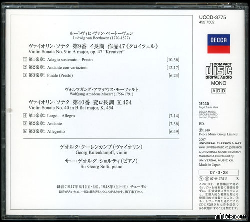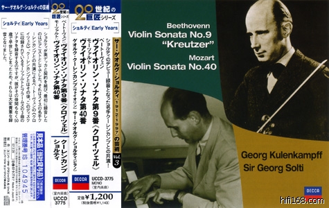 Kreutzer,以及另外一张上的Brahms第3号小奏,到1948年,他们再次合作留下了此唱片上的Mozart第40号小奏(初CD化)和另外一张上的Brahms第1、2号小奏。可以想象,录音有机会继续,可是在1948年10月5日,脊髓麻痹症带走了Kulenkampff,Solti的钢琴生涯没有前途矣!不过,老大师最后的光辉照亮了一个年轻人前进的道路。