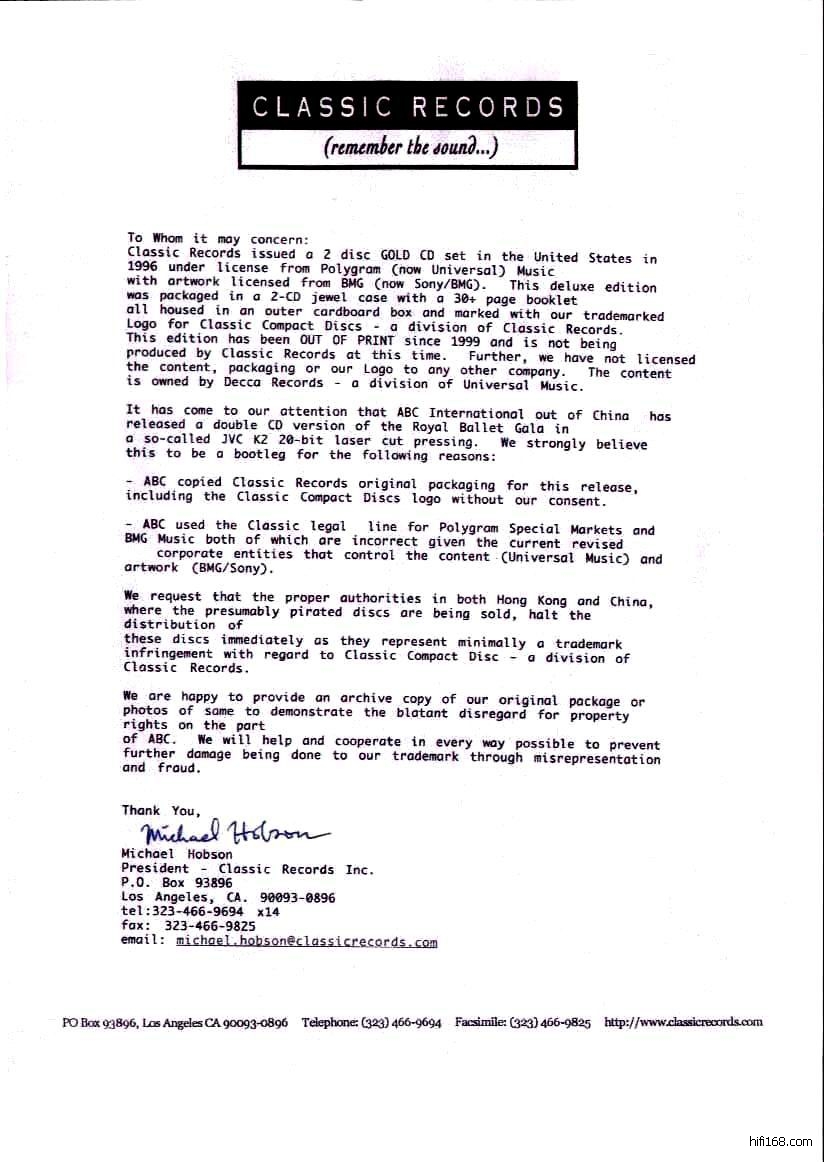 ABC的《皇家芭蕾》在香港上市后,Classic Records发出这样一封信,使得代理商瑞成收回香港市面上所有ABC版的《皇家芭蕾》