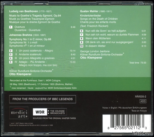 Klemperer的演绎很庄严,尤其是这首Beethoven序曲,Mahler的“亡儿之歌”弦乐阴森森,George London(1920-1985)温和的声音一定程度上缓解了这种悲伤的氛围。在Brahms NO.1中这种严谨庄重的声音显得不够过瘾,他的音乐似乎跟生活作风是相反的,也只有音乐才能把他的视线从女人那里挪开。