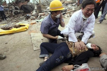 5月16日,什邡县,一名妇女得知亲人遇难后晕倒,医生为她施救(2008/5/23 23:27:55 上传)
