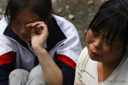 5月18日,北川县,一个女孩和一名妇女在坍塌的学校废墟旁哭泣(2008/5/23 23:27:55 上传)