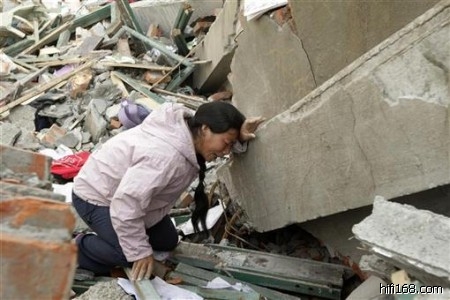 5月16日,汶川县,一名妇女在坍塌的学校废墟前悼念遇难的孩子。(2008/5/23 23:27:55 上传)
