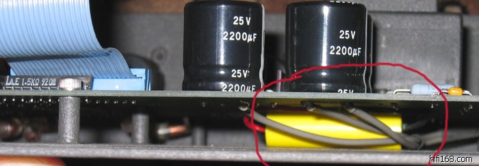 1。把电源的滤波电容从原来的6600MF增加到26600MF,并联2个1万MF的,本来想把变压器也废了,另外弄2个大容量低漏磁的装在机器外面单独装个铁壳子,数字和模拟电路分开供电,无奈拆不下来,也不敢硬来。电源变压器太小是这个机器的致命伤。哪位发烧友知道怎么拆也可以告诉我。