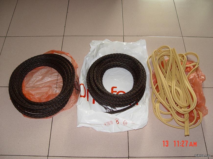 朋友送了我3捆线材,左边两捆是一样的线材(一个6米,一个8米),右边淡黄色线材的是8米。谁能告诉我左边那两捆是什么牌子的线材,现在每米卖多少钱呀?我把左边一样的那两捆线材再照了两张清楚点的特写,请大家帮我看看。