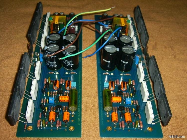 装机注意事项;1.功放VCC大于正负40V小于正负50V,电源变压器功率每声道不小于300W,两个声道最好分开电源供电,不要共地,以免引起噪音;2.保护电路用直流20到24V直流,其滤波电容不可大于470uF;推动管可用K214/J77类GSD引脚的MOS管,也可以用BCE引脚的晶体管;3.TP1,TP2两测试点间电压是静态电流在推动管上的表现,此电压在3-5V间调,一开始不要调太高,试机前请将推动管边的可调电阻在不通电时调到最大值!4.电压级与电流级可分开供电,推荐电压级+-50V,电流级+-40V,分开供电时请不要装那两只100R电阻,直接在vcc,vee处灌入直流电压;5.电阻值在一定范围内可调,无条件自行调节者严格按PCB上的标的值装;6.上电前如没有可控制电流的可调电源,请参考: 连接好所有负载,手抓电源插头,通电一秒即拔下,看电源板上电源指示灯亮灭:如果两个指示灯迅速灭掉,说明负载很重或有短路;如果慢慢熄灭,可放心玩;如果正负电源中一个灯比另一个先灭,说明输出有正压或负压(视先灭的灯而断定),这样你心里就有个底.也请喜欢这款电路的朋友加入《SF-106N功放》讨论群:1282868。温馨提示: 大电流走线如电源与喇叭输出,有镀锡层可供大家镀锡。其他大电流处则采用了两面走线。有镀锡层的大电流走线,在不镀锡的情况下,载流量已经可达到10A。所以,没有大功率烙铁,或无条件将锡熔得很平整的朋友,无需去镀锡。 图片为晚上闪光所拍,实物会更漂亮。我已经准备了120只贵族0.2R/10W的电阻,