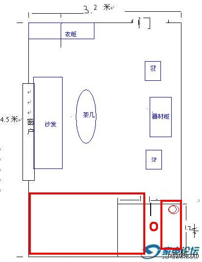 右下角是一个长为1。2来,宽为1。1来的洗手间,这个房间只是用来听音乐的,摆了好多次,都不很理想,想请朋友们帮帮忙,谢谢!