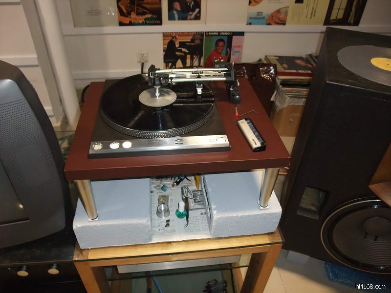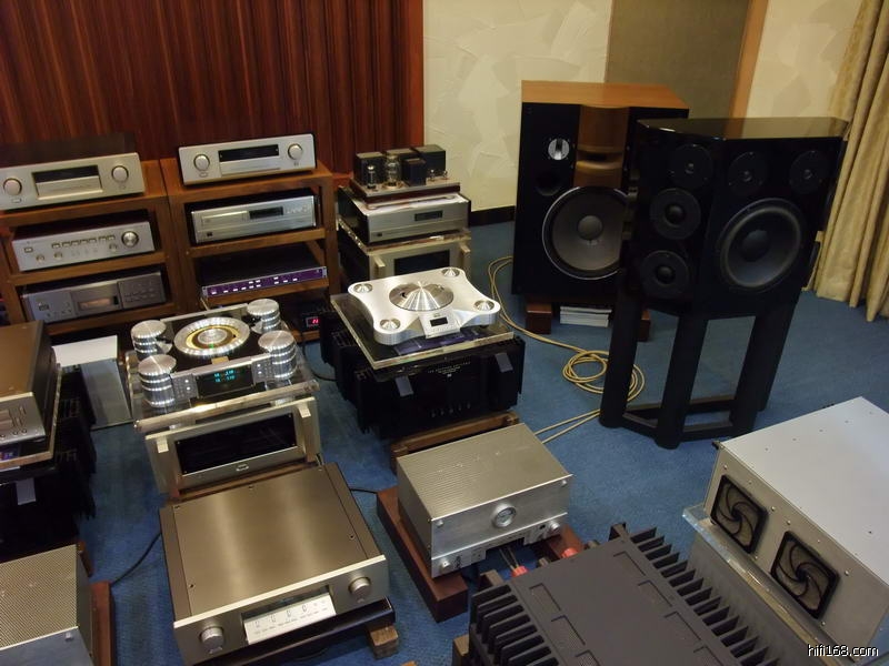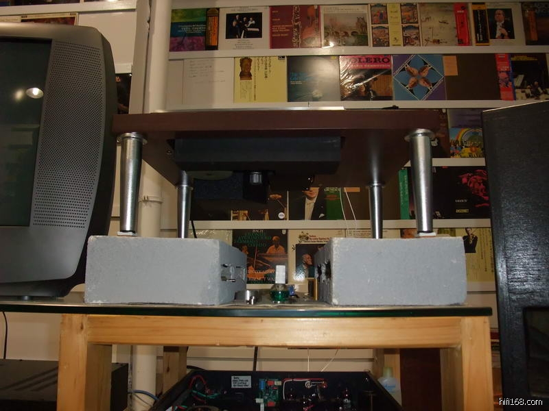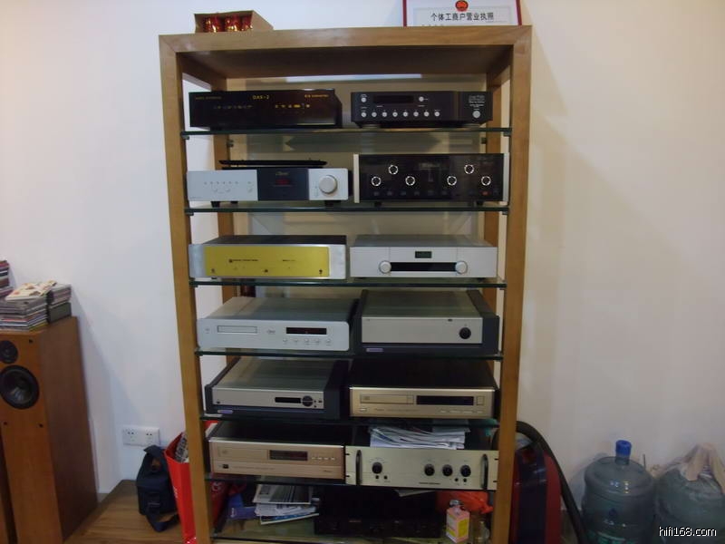 店中使用的前级和唱放都是MENN的产品,唱盘是先锋的皮带盘加德国的Souther直线臂加高度风1K多的MC唱头,这么便宜的唱头出来这么有质素的效果实在让我大感意外。仔细研究下发现这个先锋的唱盘的木质底座和那几个铝合金高脚原来专门定做的,最特别的是安放唱盘的几个轻质水泥砖块,据说是MENN在附近工地上拿一包香烟从民工的手里换回来的,现在那些民工碰到MENN都会问他:“还要不要砖头啊?”