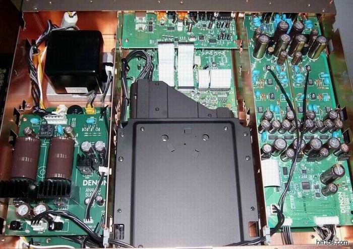 再來看內部線路,機內隨處可見高級Silmic濾波電容,方形EI電源變壓器看起來紮實無比。視訊線路方面採用最新Sil504循序掃描晶片,這個晶片功能強大,不僅2:3 Pull Down具備,還有多種檢測視訊功能,外加一個64 Mbit SDRAM來儲存四個圖場做緩衝,增加運動影像的清晰精確度。而在視訊D/A方面則採用最高規格的ADV 7304 14Bit/108MHz晶片。有關視訊方面請看「新視聽雜誌」,在此就予略過。在音訊方面,DVD-A1採用他家有名的AL24處理晶片(Denon DXP7001AF),可以降低數位類比轉換時產生的量化失真,讓非常低電平的DVD-A或CD訊號都能夠精確再生。而在D/A晶片方面則採用8個Burr Brown PCM1704 24Bit/192kHz晶片。為什麼用8個呢?因為前聲道(左、右聲道)就各用了二個,剩下四個給中聲道、左右環繞以及超低音各一個。以這個陣仗來看,真是無法再豪華了。