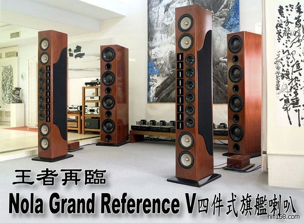 王者再临 - Nola Grand Reference V四件式旗舰喇叭(《影音部落》廖斐森报导)一般常见的两件式喇叭即使再高大,到了Nola Grand Reference面前恐怕仍旧不得不俯首称臣,因为这套四件式喇叭主音柱(Main Tower)宽30.5公分、高213公分、深40.6公分,超低音柱(Subwoofer Tower)宽33公分、高213公分、深66公分,总重量超过540公斤(净重,包装运送重量超过一公吨),而每声道由4支12吋超低音所构成的低音柱,不仅极低频可延伸至16Hz,于20Hz处的音压更可达到120dB!无论身形或声势,Nola Grand Reference都真正具有王者风范。为何Nola Grand Reference要造得如此高大、如此沉重,又为何要配置那么多的单体(每边9支铝带高音、6支中音、4支低音与4支超低音,每声道共计23支单体)?其实理由只有一个:它高大的四件式架构与众多的单体,就是为了完美回放「所有的音乐」而诞生的。一般中小规模的音乐类型,有不少优秀的两件落地式甚或书架式喇叭都能掌握得不错;但谈到大规模交响乐的回放,要能和Nola Grand Reference这类四件式大喇叭相抗衡,两件式架构者可就屈指可数了。