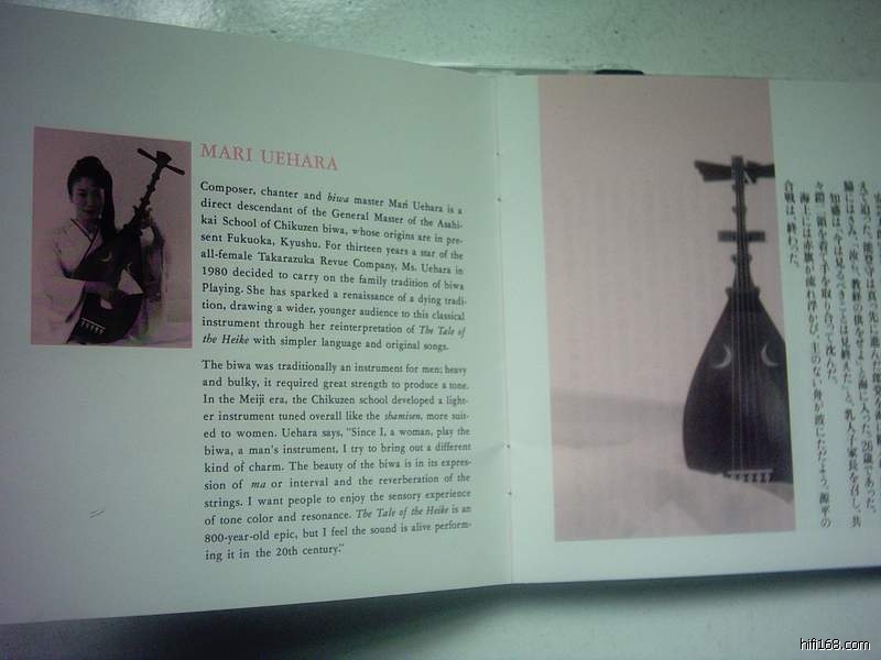 此张唱片的演唱者为筑前琵琶传人上原麻里,她很好的发挥了筑前琵琶凄伤哀婉的特点,把此曲演绎的悲壮而富有历史感。