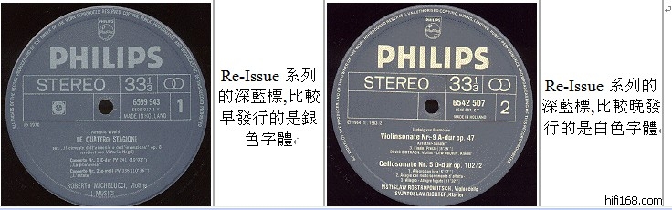 PHILIPS的蓝LABEL一般用于70年代中期以后发行的盒装唱片或Re-Issue唱片,银字label的一般在1978年之前,之后基本就采用白字了。红色label也是这样,但一般用于正价系列,编号6500XXX的全部和9500XXX的一部分首版是银字label。