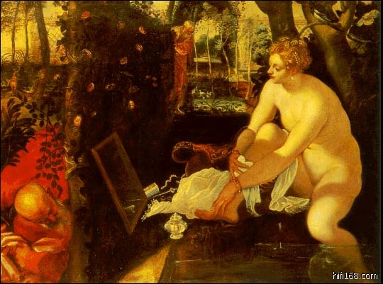 在丁托列托最负盛名的女体作品《苏珊娜出浴》、《浴后的苏珊娜》中,丁托列托发挥了他描绘曲张健美的人体的专长,柔和的光韵使柔嫩的肌肤焕发出异样的观感。英国十八世纪油画大师荷加斯认为这两幅画的成就“的确比得上米开朗基罗”。《苏珊娜出浴》是《圣经》中的一则故事:苏珊娜是商人的妻子,在家中的池塘沐浴,族中的两个长老乘机偷看她的胴体。当然在丁托列托和许多画家的笔下,题材本身的道德感已经处于次要地位,他们首先考虑的是如何借助“沐浴”这一情节更好地表现女性裸体。(就是上面这幅)