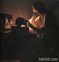 楼上,是法国画家拉 图尔的杰作,他最擅长描绘幽暗背景下的烛光。s兄,我也非常喜欢丁托列托,因为他的作品预示了浪漫主义的许多表现手法和因素。
