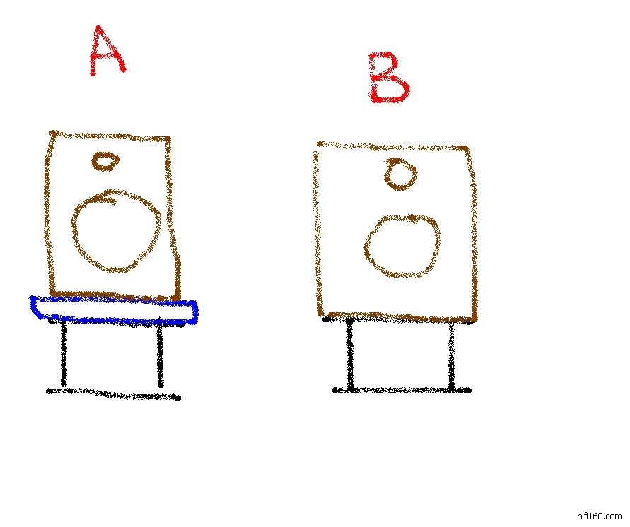 与把书架箱直接放在铁质脚架上面,没有大理石板,声音差别大么?(图示B)
