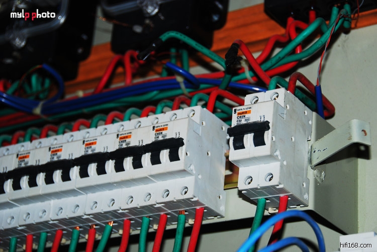 掏出独门武器——西门子80A双位空开,好家伙,明显比梅兰胖了一位,没办法,把两头的固定扳手拗一拗,大家挤一挤,总算给装上了!图中蓝色的电线就是6平方的倍耐力线。