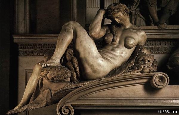《夜》与《昼》、《晨》、《暮》,是大理石雕像,为美第奇家族的陵墓所作,现位于罗马。《夜》是一个身材优美、健壮的女性,正在深深地沉睡着,脚下的猫头鹰象征着黑夜的降临,枕后的面具则象征着恶梦缠身,她似乎已经精疲力尽,只有在梦境中才能得到安宁。美第奇家族陵墓和其雕塑作品是纪念碑式的杰作,是米开朗基罗艺术生命中重要的转折点。这四件雕像所表达出的焦虑、紧恐慌、惊吓以及带有辛酸的屈服,正是作者心灵深处真实写照。米开朗基罗面对处于动荡之中的意大利现实社会,人文主义的理想破灭了,他的思想开始变得深沉和苦闷,作品中留下的只有对祖国命运的担忧和对人类美好未来的感伤。