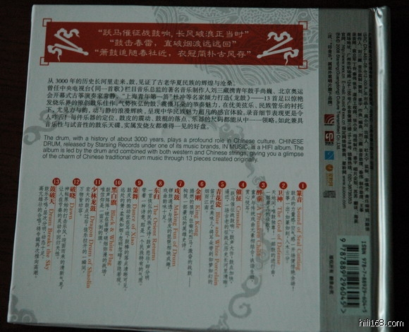 与其他鼓碟不同,这张的鼓乐有古筝、笛、鼓、人声等多钟元素的搭配,不是单纯鼓乐炫技,讲求鼓的气势。碟背面对每一首曲的评述比较客观。印象最深的是第一首“篆音”,确实有惊艳全场的感觉。一开始鼓的独奏,鼓点清晰,震撼,鼓皮震动的现场感非常强烈。接着,古筝的出现,音乐旋律有些“古今大战秦佣情”中主题曲“焚身以火”的影子,古筝演奏的效果非常独特,韵味与一般市面所卖的以古筝演奏的流行曲完全不同。鼓乐场景宏大,如置身于大漠。碟中的注释“鼓势如洪,酣畅淋漓,古筝一出,如篆如刻,入木三分”,“这是怎样的一种铭记?仿若一个千年的约定,冥冥中相随”