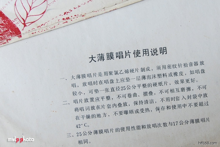 至于薄膜唱片,由于材质柔软极易变形,确实应该横放,请留意以下印刷在唱片封套上的文字:不可将唱词放在片套内叠放。这说明了唱词叠放对唱片会有损害,这可以引申出另一个问题,早期的绝大多数的国产唱片,要么歌词印在封套的背面,要么就只有一张跟封套差不多大小的纸,没别的东西了,然而现代出品的密纹黑胶唱片,里面的内容就丰富多了,有大海报折叠封装附送,有厚厚的小册子,有些还有明信片及歌手的歌迷会申请表等资料,甚至还会装上一只3D眼镜,象这些唱片,如果还是采用横放的方式,那就惨喽。。。