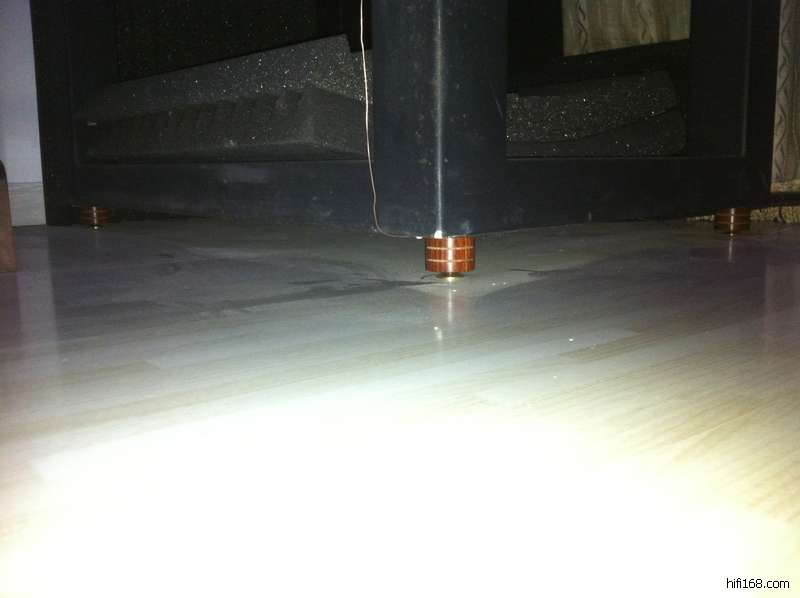 下面我重点说说西湖音箱及其脚架的避震。由于西湖喇叭的输出能量特别的巨大,在高声压大动态的时候器材本身的谐振非常大,特别是音箱与脚架结合面的谐振点,如果这个面得共振频率不协调,那就会对声音的整个频段产生负面影响,遗憾的是,这两个面得共振频率永远也不可能一样,因此,我们只能通过一些方法将其相互之间的影响降低到最小。所以,音箱与脚架之间必须要垫避震钉垫,而且一定要效果好的钉垫。我至少试过十种以上的钉垫,最终所选择的是价廉物美的挪威钉,一边放四个,分别放于脚架四根立柱的正中间,挪威钉的下面要贴羊毛毡,保证音箱的平稳。脚架下面使用的是紫檀木脚钉,其中该脚钉的中心夹着一个5mm左右的纯铜的钉尖,把这个脚钉垫与四根立柱的正中间,下面再垫上钉垫即可。脚架下面使用M8规格的挪威钉效果也不错。另外,定制的脚架高度也要注意,以BBSM12为例,脚架高度最好在55~60CM之间。请参考以下几幅图片。