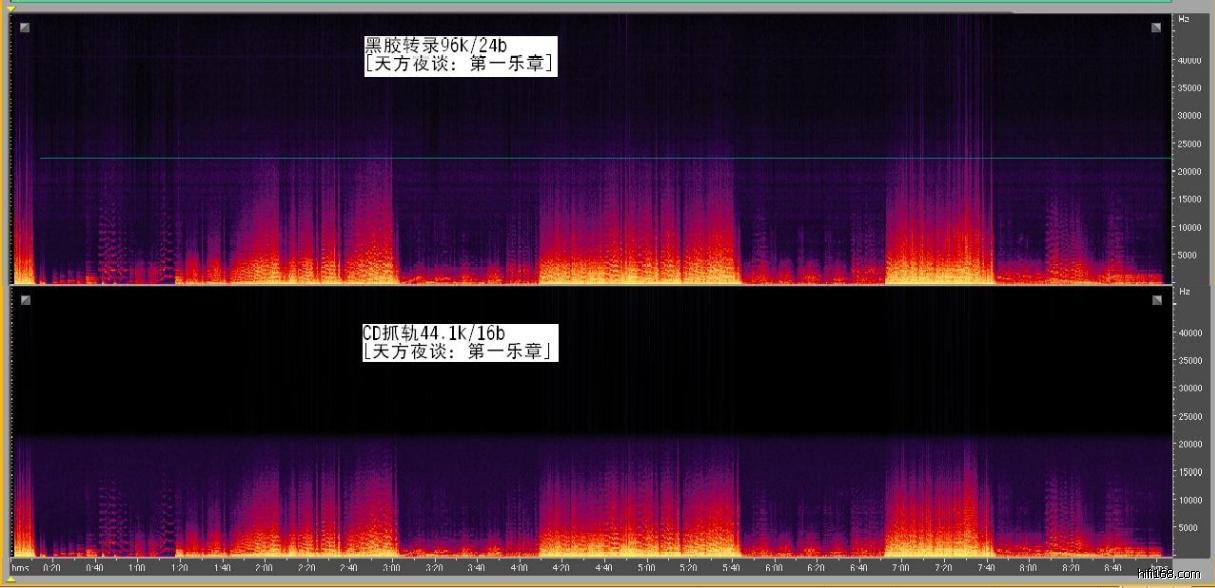 http://music.88bx.com/viewthread.php?tid=48597&highlight=%BA%DA%BD%BA),供大家试听和比较。 另一个网友jmlcy(在19楼)发布了这些音频的频谱图,让我们比较直观地了解,黑胶转录与CD音频的区别。如果这些频谱图是准确的,黑胶转录受欢迎就找到了科学的根据,而不仅仅主观的感觉了。希望有条件的朋友验证一下。