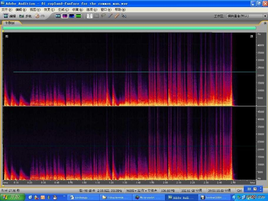 可以看出24bit-96kHZ之LP-WAV音频频响明显要宽,高频达到了32kHZ,听音感觉也是如此,CD音频实际上将22kHZ以上的高频截掉了,严格意义上来说,CD音频并不是无损音频。