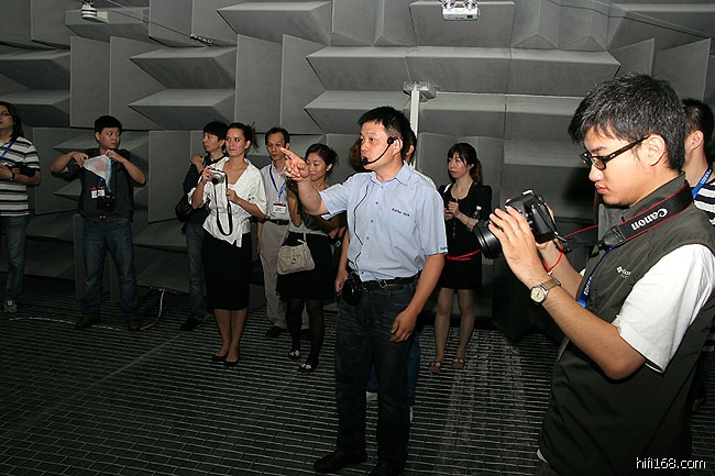 张总给大家介绍消声室的用途,不少新闻单位的媒体人不是发烧友,都觉得这个消声室好奇怪,呵呵。