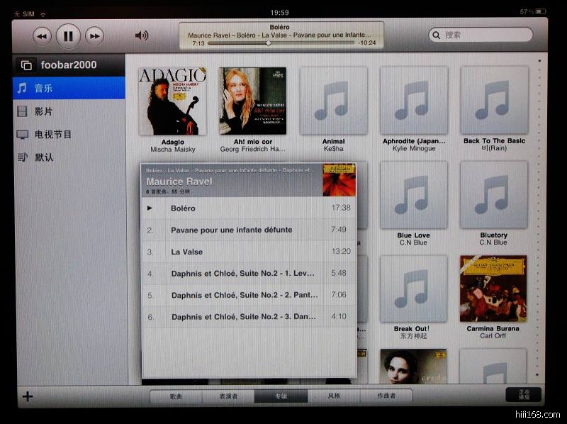 http://mp3.zol.com.cn/242/2424522.html,下载了FOOBAR插件,微软.NET程序等,也在IPAD上下载了Remote软件,按照文章写的,最后连上了电脑的FOOBAR,出现了硬盘的专辑列表,还有CD封面。操控IPAD,换碟选曲真是方便,反映很快。下面是两张截图。不过有些没有显示封面,看来得好好整理下自己的数字音乐了。