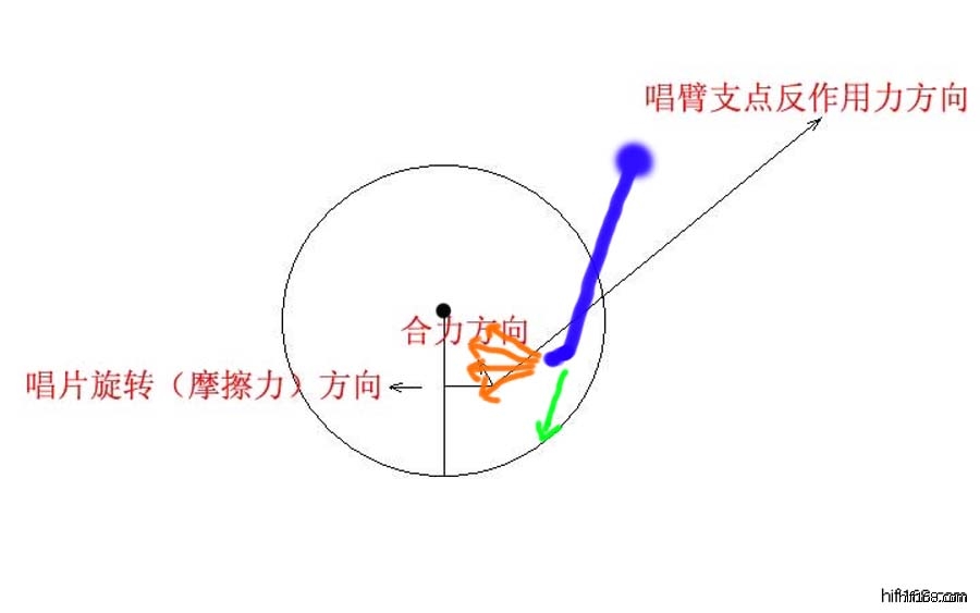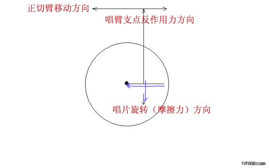 原帖由 中山张 于 2011-9-25 0:58:00 发表以下蓝色的就是正切臂的力轨运动方向,垂直90度的是坑纹顺时针转动时给唱针向前拉的力(这个力不用理会);另一个横向180度的力,是由于锣丝形的槽坑转动时慢慢一圈圈地把唱针向盘中心拉的力,虽然这个运动从力学上是会有惯性力的产生,但这个惯性力是微乎其微的,在唱头担杠向左侧移动时自然把它抵消。[