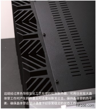 论外观设计,Pass Labs 向来崇尚简约朴素,因此你从来不会在他们的器材上看到浮夸的线条、复杂的结构和眩目的色彩,他们早已建立起自己的品牌符号,以富有力量的硬朗线条来打造出坚实的厚重感。Pass Labs X600.5后级功放的前面板采用了复合结构,单从正面外表来看,X1000.5 与同系列其他几款型号一模一样,正套面板设计由19mm 实芯铝主基板和靠前的25mm 实芯铝副面板组成。在主基板中央区域,上方是通电工作时泛出幽幽蓝色光芒的圆形指针式电流偏压表指示表,下方是电源主开关;前面2 块面板内侧以半圆形线条组合处理后,成为一个比指针式指示表面积稍大的圆形、用内六角螺杆固定在主基板上形成手挽的结构。这个复合型面板,而圆形湖水蓝电流偏压表无疑是面板上最大的亮点,而且已成为Pass Labs 新一代XA.5 系列和 X.5 系列的标准形象,区别在于X350.5是350W×2 的两声道机箱,X600.5 是600W 单声道,而X1000.5 则是1000W 的加长版机箱。X600.5 机箱的两侧是超大型散热器,俯视可见具有复杂造形,因此带来庞大外表面积,这组经过黑色阳极氧化工艺处理的铝制散热器,可将功率放大晶体管工作时产生的热量及时适量地散发出去,保持晶体管的热平衡,确保晶体管在设计温度下以非常稳定的状态工作。