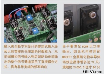 上述的理念和设计,在Pass Labs 公司随后推出的XA系列功率放大器、X.5 系列功率放大器、X 系列前级放大器的各款机型中,都被使用并延续下去,包括了本文的主角PASS X600.5 单声道后级放大器,它的地位在X.5 系列中次于旗舰的PASS X1000.5 而居高端主力之位。Nelson Pass 先生认为应该尽量避免深度负反馈,只采用局部负反馈和尽可能简单的线路设计是他努力的方向。专利的超对称线路完全体现了A 类单端和平衡放大的概念,充分发挥了共模抑制的能力。为此,Nelson Pass 令超对称平衡放大器中的两组放大线路从零件到线路布局都达到精确配对,结果使噪音和失真大大降低。在这基础上,超对称线路在输入级后面采用了特殊的交叉补正线路连接两组放大器,进一步地使两组放大器输入部分的噪音和失真完全相同,紧接着的平衡放大线路便可顺利地将这些噪音和失真抵消掉,使输出信号的噪音和失真能进一步降低