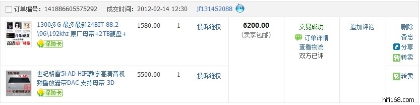 2月14日,购于淘宝,是我今年折腾的开端,购入时连同2T高清音乐硬盘,共价6200元,以下有定单截图,9.99新,使用不到2个月,相当于帮下手煲机了,现以原套餐形式转让,介意二手,请去买新机。转让价5500元,不议价,自提减100元,广东省内包顺丰快递,外省包德邦。