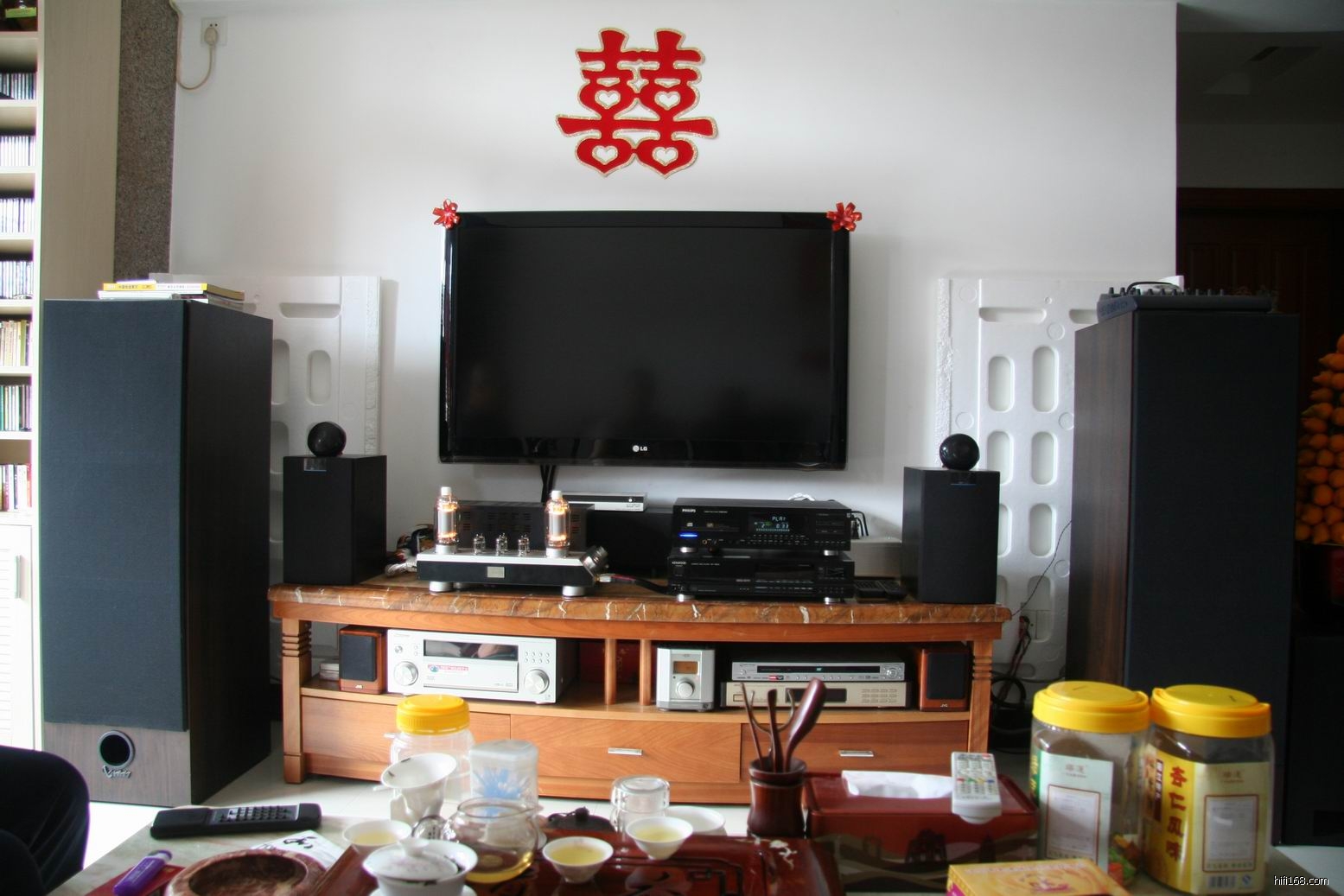 叶生的器材由成品和DIY组成:经典长青飞利普850MKII CD机,大功率直热四极功率胆管813合并机,音箱是自制三分频双12寸低音落地箱。播放交响乐时动态凌厉,干净利落,大功率胆机表现人声方面柔细、自然,感觉不到生硬,众人纷纷拍手称奇。去年已到访过叶生,今年器材整体提升不少,叶生说有这样的表现是他着重线材方面处理,看来音响永无止境,一分耕耘一分收获。