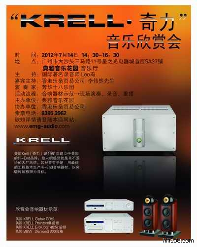 2012年7月14日典雅音乐花园将会举行美国“Krell.奇力”音乐欣赏会,活动现场将会播放多张极具珍藏价值的CD软件让各位爱乐人士可亲身体验来自美国知名品牌“Krell.奇力”功放配搭英国B&W Diamond800音箱的真正实力!门票有限,有意者请到典雅音乐花园免费索票!时间;2012年7月14日 14:30-16:30地址:广州市大沙头三马路11号星之光电器城首层5A37号 典雅音乐花园索票电话:83853962若需了解更多详情可登录本司网站:http://www.emg-audio.com/