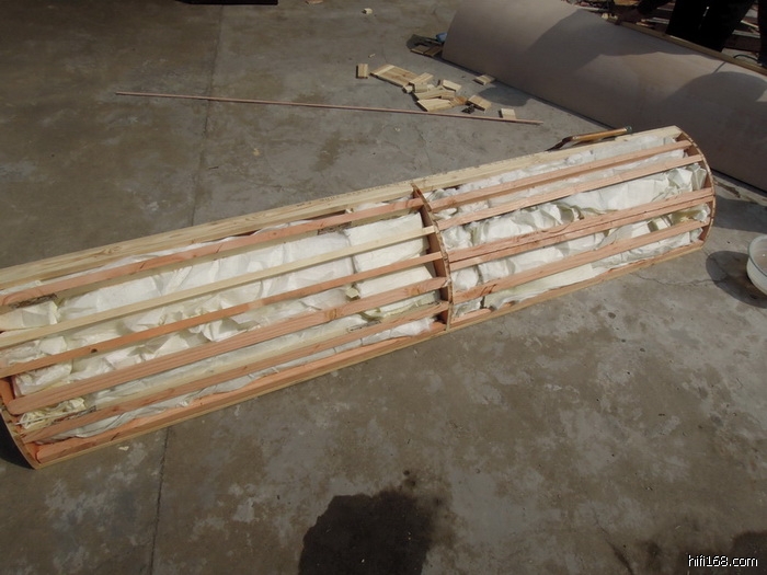 1、后墙角的圆弧处理是考虑到房子要拆,做成了活动式的,这个圆柱是可以拿走的,高度2.44米,至于天花四角驻波昨天小丫兄也提到了~打算买两盆塑料盆景丢上去试试效果~~~圆弧内是高容重的玻璃纤维棉,为了塞满塞结实这个玩具,鄙人头戴头盔,穿了一身旧一付系好手脚衣物,带好皮手套纱手套,倒腾了快一上午~~~