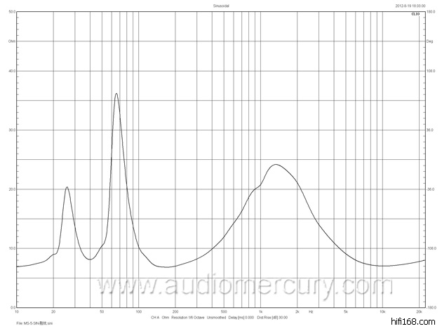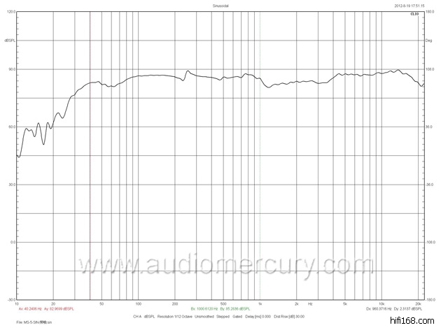 我们在2008年已购置了意大利的CLIO专业的电声测试仪,这次的测量在我们公司的试音室里进行,客观测量结果接近模拟设计值,测量设备:CLIO电声测试仪8.03版本,测量条件:1米1瓦,测量话筒离地1.2米,测量室温:25摄氏度,测量图表如下: