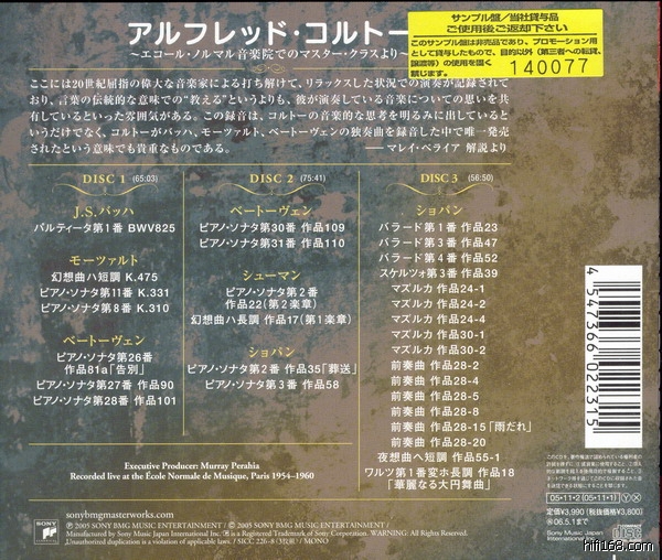 先说第二套:SONY公司出品的CORTOT大师班录音,录音年份1954-1960年间。佩拉西亚特别推荐,少量的解说,曲子为课堂示范。堪称神品。其中BACH 帕蒂塔第一号 、 肖邦的几首玛祖卡,前奏曲、舒曼的第二钢琴奏鸣曲 是我最喜欢的演绎,演奏的聪明之极。极尽变化之美。
