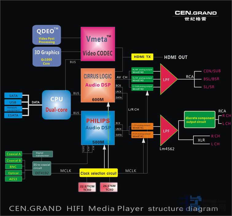 可以看到,9i-AD的系统时钟MCLK与其它播放器有所不同,时钟源直接向DAC输送时钟信号。不具备这个构架的播放器,必须使用DSP内部分立出来的MCLK,否则不能同步。9i-AD依赖独特的同步技术,使DSP与DAC两大不同的系统均能直接使用时钟源,DAC部分的时钟jitter达到了hifi时钟源的高标准,9i-AD的高性能即源自于此。外部独立音频双时钟架构,是世纪格雷与美国marvell公司合作研发的hifi音频构架,世纪格雷拥有独家使用权,并最先在国内推出外部独立音频双时钟构架的产品。