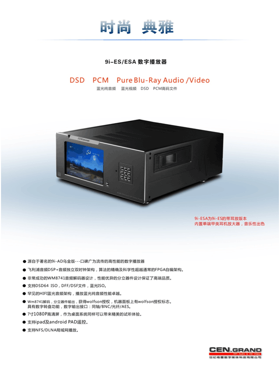 9i-ES/ESA是世纪格雷新推出的两款中价位数字播放器产品。9i-ES为数字播放器,带有模拟输出及数字输出,9i-ESA则是在9i-ES基础上,增加了一组