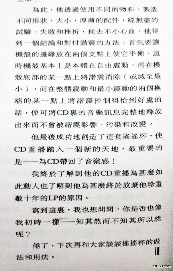 与大家分享:如果难以找到这种“黄花梨”木杯,可找来云南下关特级沱茶垫着玩,放置方法与放木杯相同,但要注意三个问题:(一)如果所垫器材上用的电源线是音色型的,即要改用能量型的。(二)三个沱茶的高度要找到一致的,成金字塔型垫上器材,垫好器材要用水平尺打好水平,哪个造成不平的沱茶要稍磨一磨它的底。(三)要注意器材是在插好电源线和信号线或喇叭线的待用状况下垫左右两边的,成“天平称”般的平衡后,再垫器材面板前面中间机底的位置。这三个问题有一个没做好,都会造成劣声,不如不玩!
